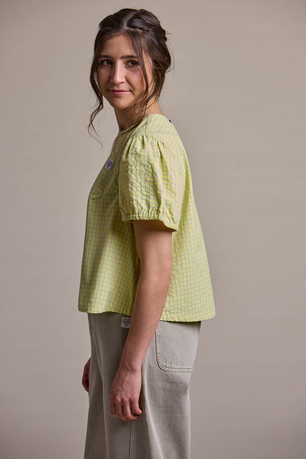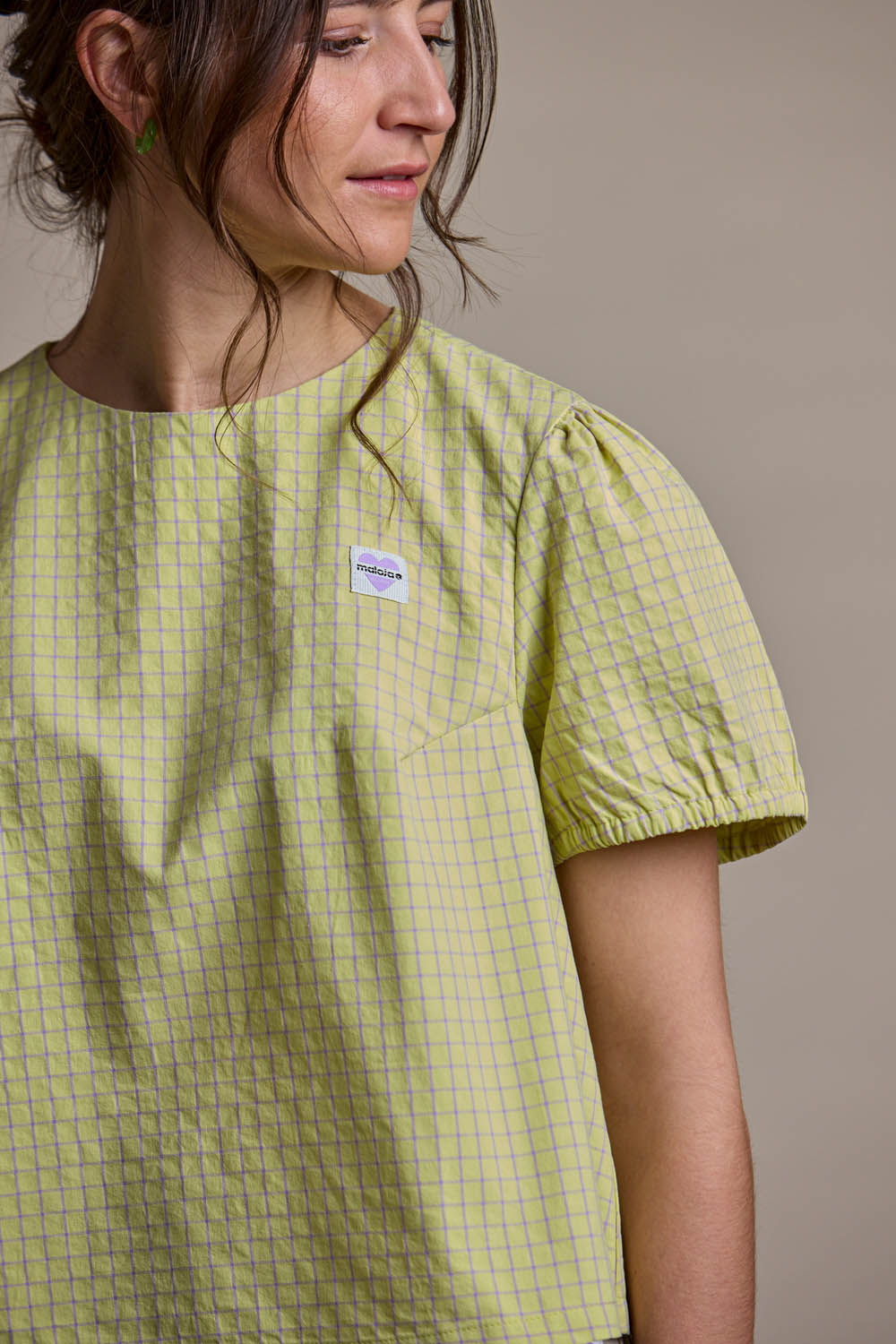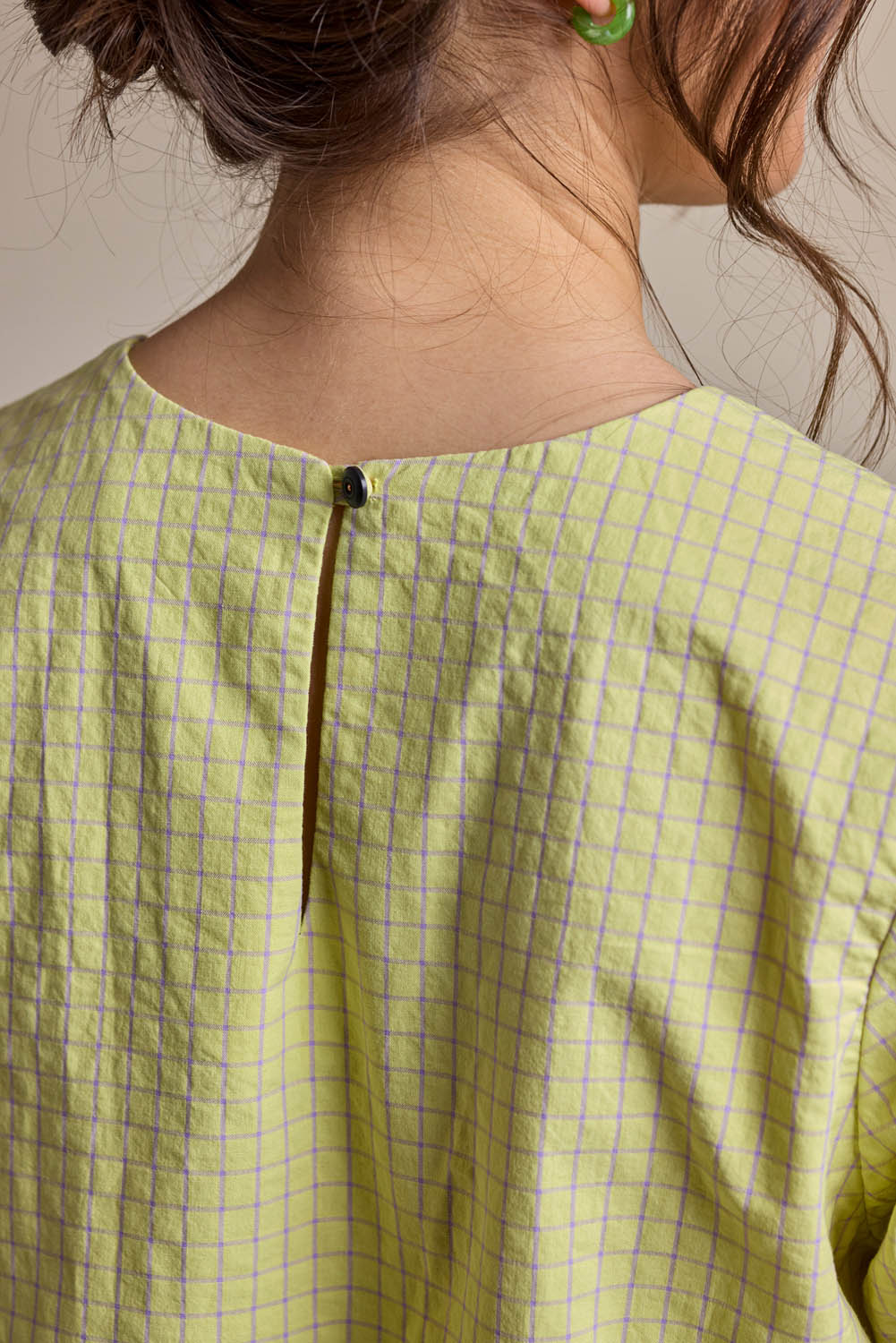 AlbertaM. blends modern minimalism with playful volume. Its cropped, boxy cut is paired with wide, softly puffed sleeves to create a bold and effortless silhouette. A small slit with button closure at the back neckline adds a subtle design feature and easy wearability.