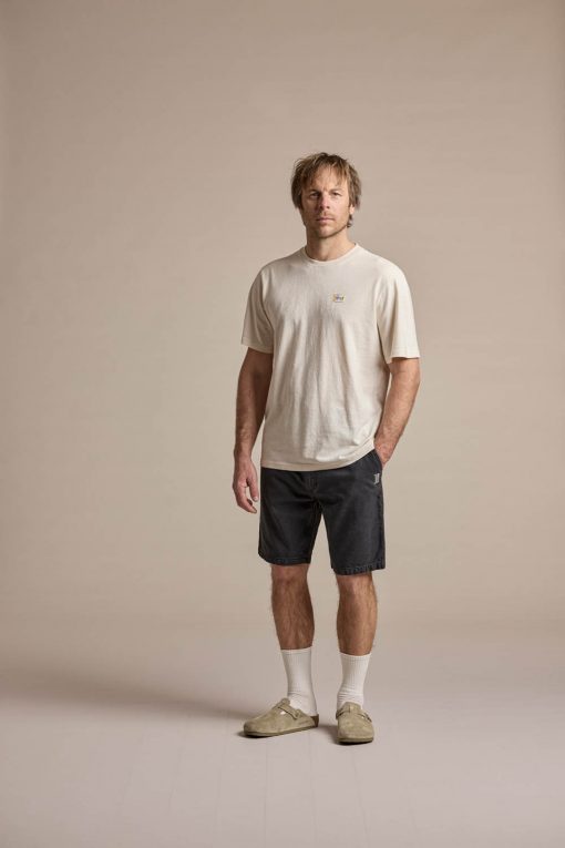 ColvM. ist ein schlichtes T-Shirt aus Undyed Hemp Jersey, gefertigt aus Hanf und zertifizierter Bio-Baumwolle. Beim Stoff wird bewusst auf Bleichen und Färben verzichtet – zwei Schritte, die besonders wasser- und chemikalienintensiv sind. Dadurch bleiben natürliche Baumwollschalenreste im Garn sichtbar, was jedes Teil zu einem Unikat macht.