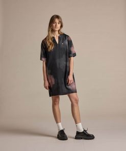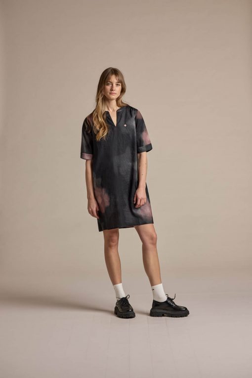 Available in two solids and two floral-inspired prints – “Bloom” and “Sunleaf” – this dress brings freshness to your wardrobe. Featuring a V-neckline with a stand-up collar, delicate ruffle details on the shoulders, and softly draped pleats at the back, it creates a flowing and relaxed silhouette. A subtle highlight: the Tagua nut button adds a conscious and natural touch.
