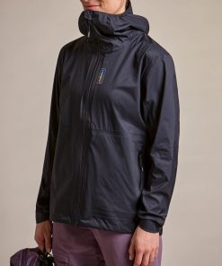 The technical Superlight Shell fabric offers durable wind and rain protection (20,000 mm water column) with a subtle ripstop texture for tear resistance. Its PFC-free water-repellent finish helps water bead off the surface without using potentially harmful fluorinated compounds. Fully taped seams, a small storm hood, two hip pockets placed high enough to stay accessible under a backpack strap, and reflective prints complete the jacket’s functional setup.