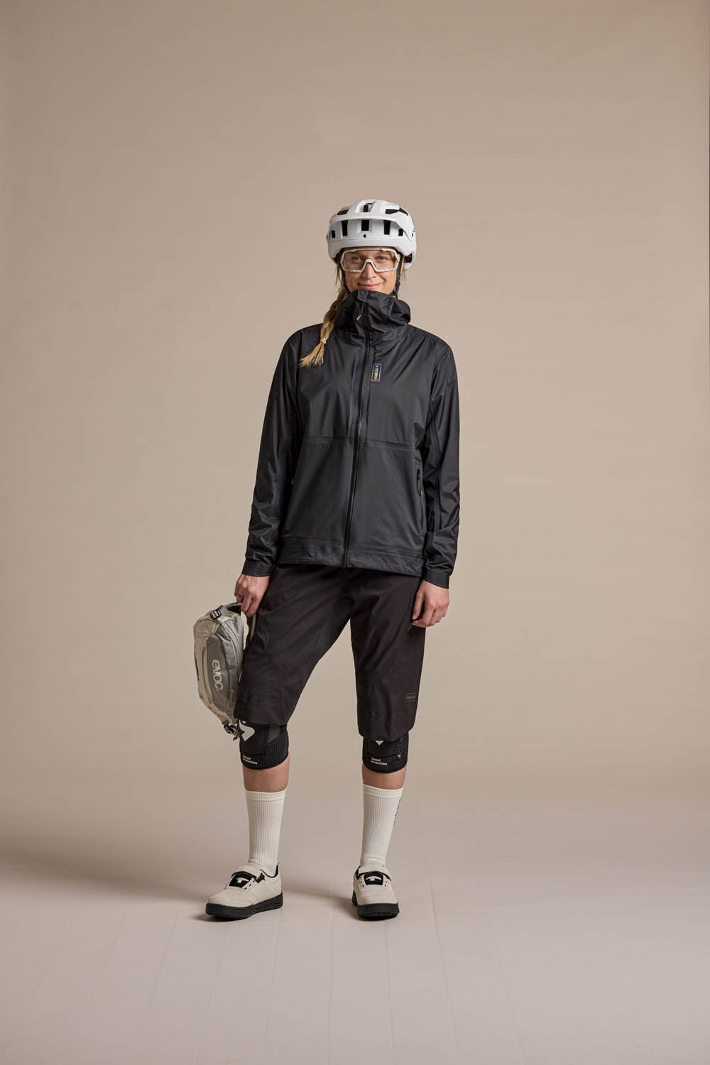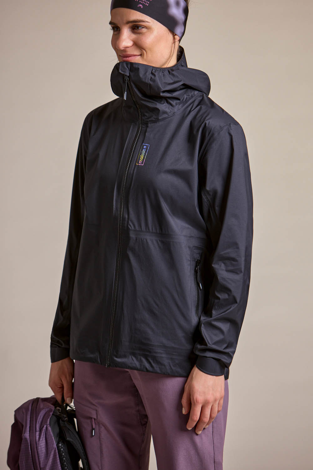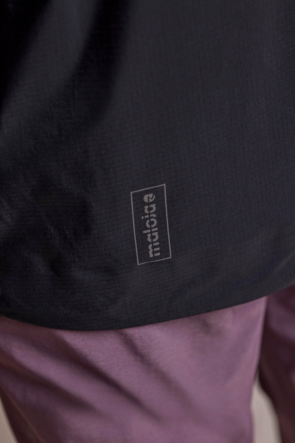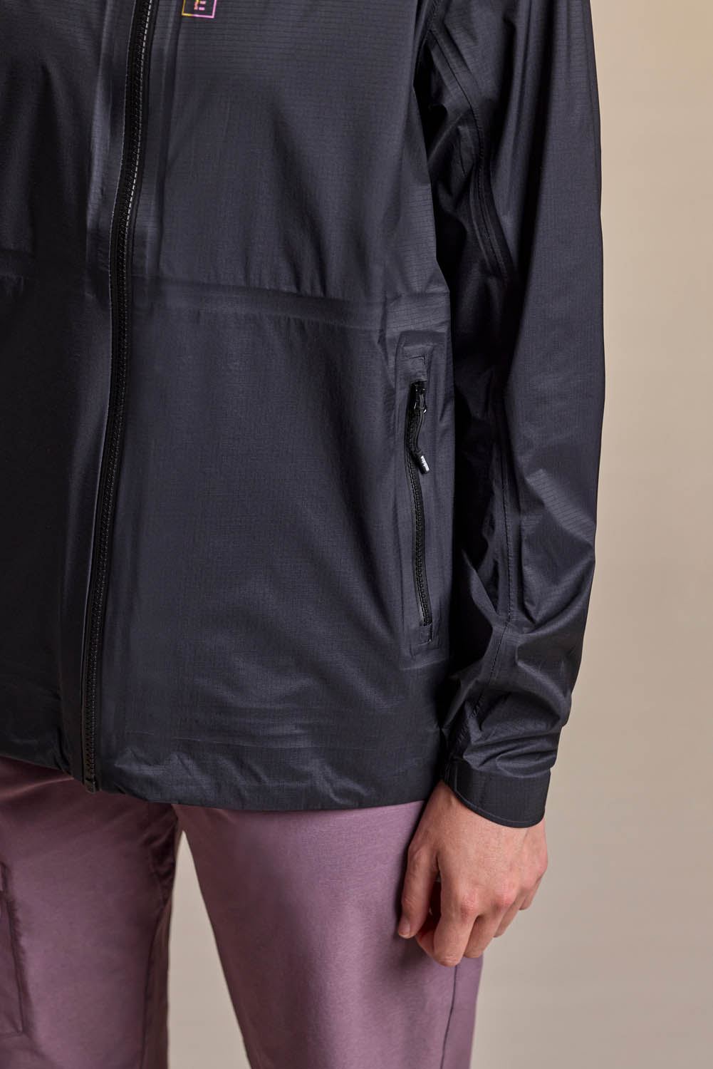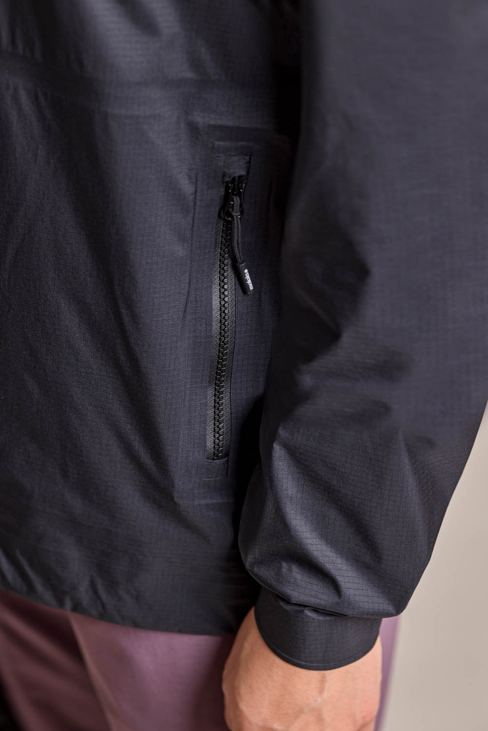 The technical Superlight Shell fabric offers durable wind and rain protection (20,000 mm water column) with a subtle ripstop texture for tear resistance. Its PFC-free water-repellent finish helps water bead off the surface without using potentially harmful fluorinated compounds. Fully taped seams, a small storm hood, two hip pockets placed high enough to stay accessible under a backpack strap, and reflective prints complete the jacket’s functional setup.