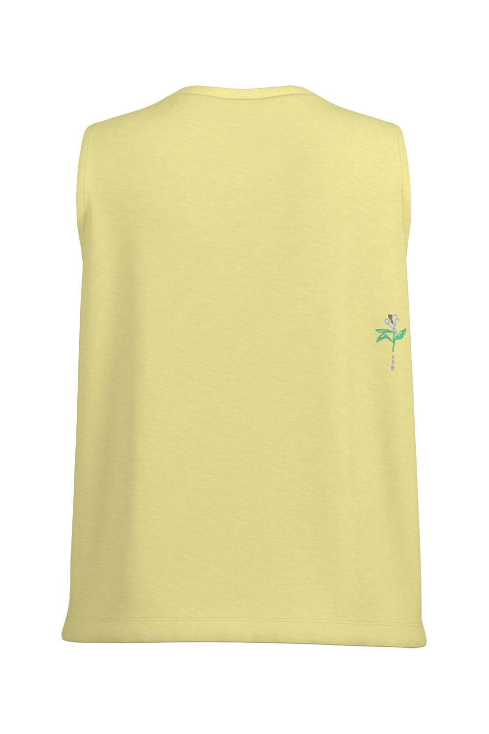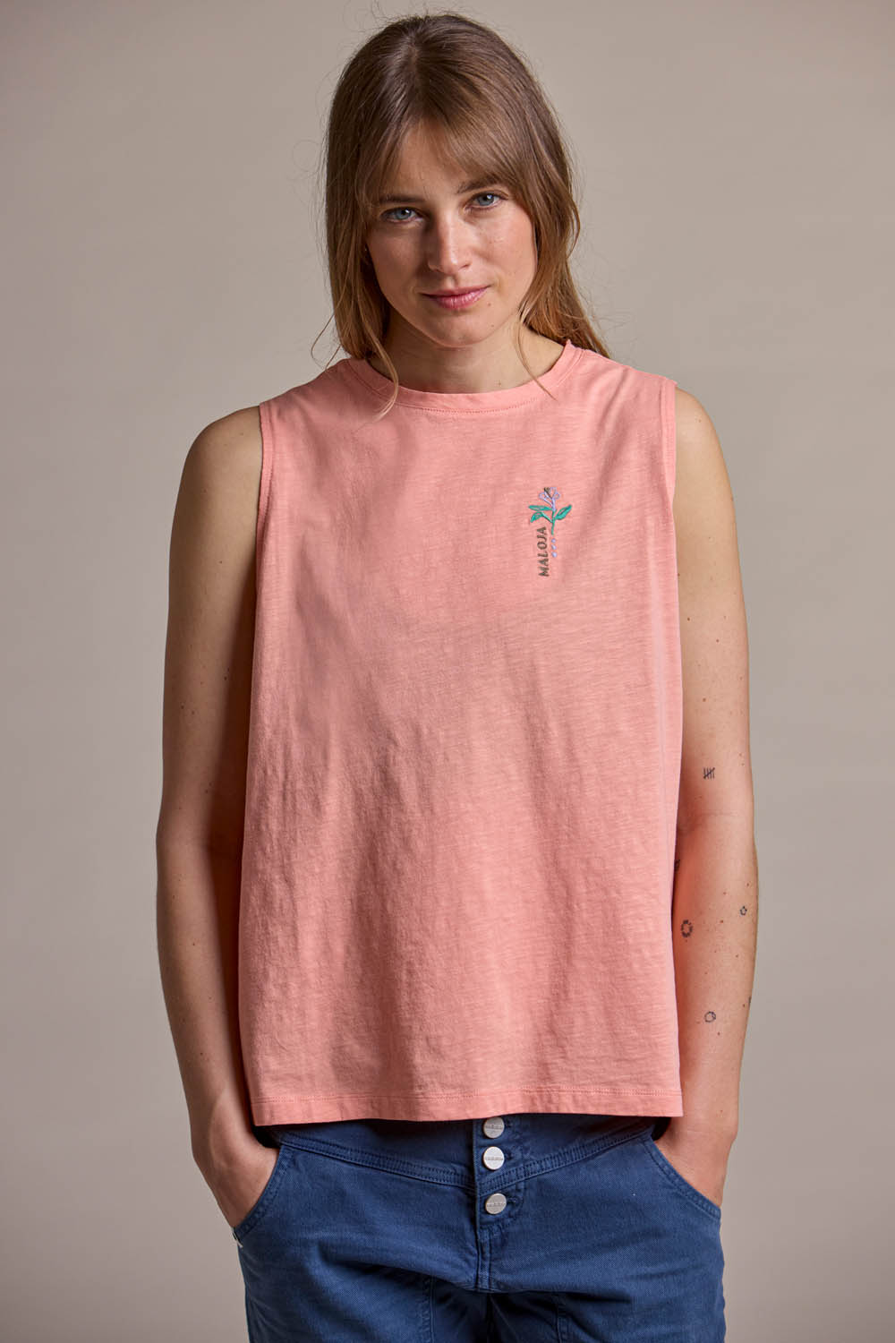 TaranakiM. tank top, made from soft organic cotton, combines delicate details with a naturally comfortable feel. Featuring charming iris flower embroidery on the chest and back, it evokes the image of a blooming summer meadow. The distinctive structure of the flame yarn jersey (Jersey Flamée) gives the fabric a lively texture and a soft touch. Available in soft, seasonal colors, this tank top brings effortless charm and style.