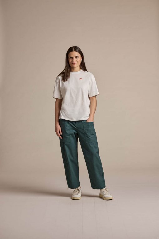 TswanaM. verbindet künstlerischen Ausdruck mit nachhaltiger Streetwear. Das kastig und modern geschnittene T-Shirt aus zertifizierter Bio-Baumwolle gibt es mit drei individuellen Aquarellgrafiken am Rücken – „Forest“, „Bike“ und „Mountain“ – die jeweils für einen Aspekt der Naturverbundenheit stehen. Die weit geschnittenen Ärmel mit überschnittenen Schultern und breiten Rundhalsausschnitt verleihen dem Shirt eine lässige, zeitgemäße Silhouette. Dank elastischem Single Jersey ist das Material weich, pflegeleicht und angenehm zu tragen. Ein Statement für Kreativität, Komfort und bewussten Konsum.