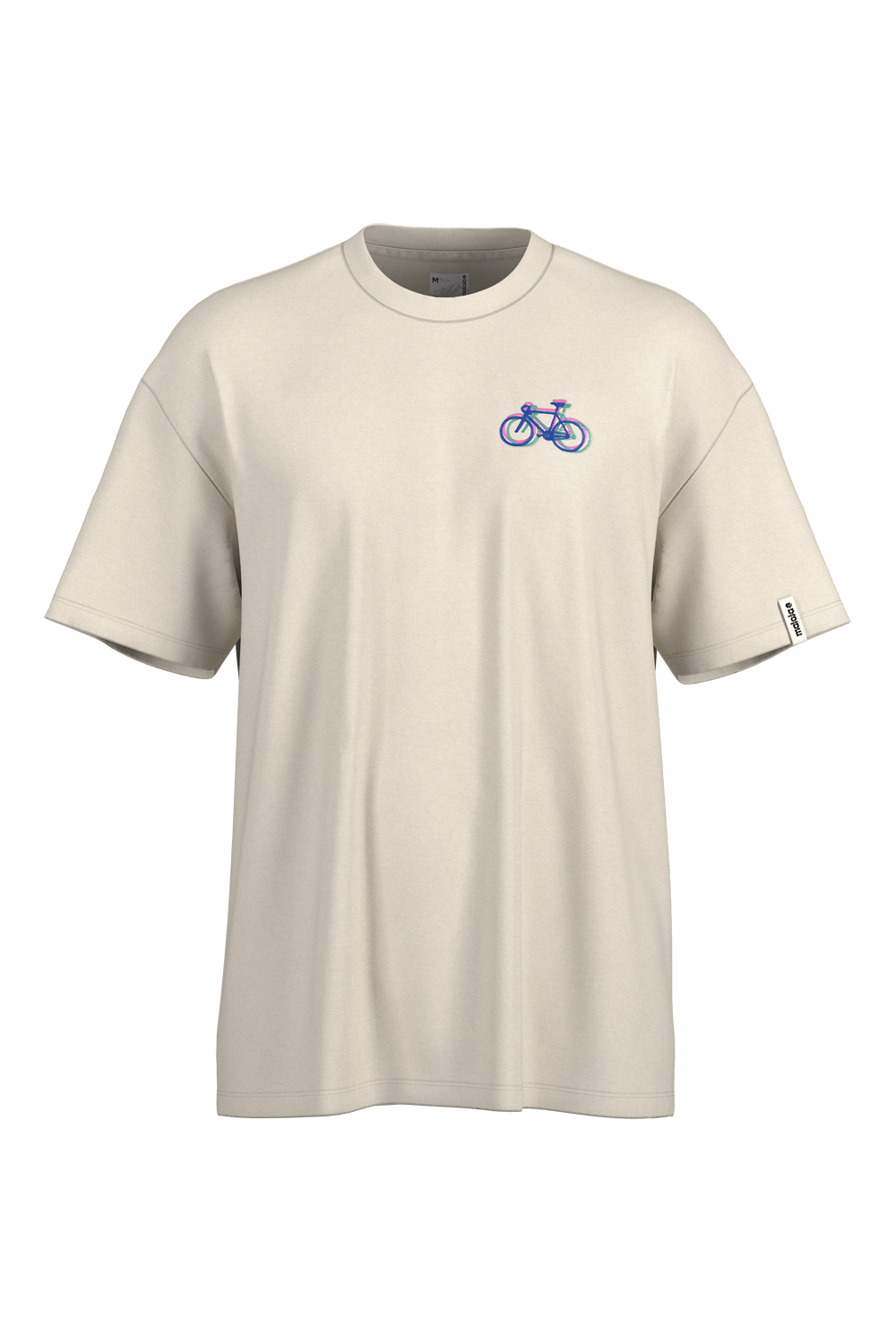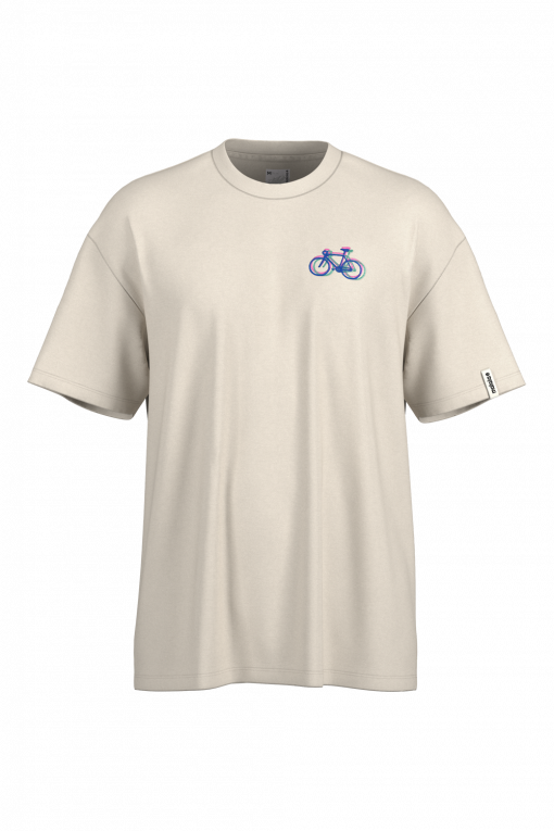 WaxenM. is a relaxed, oversized tee with dropped shoulders, a close-fitting crew neck, and a wide ribbed collar. It features three minimalist embroidery options – Rainbow Smile, Natural Smiley, and a three-colored bike – adding subtle personality to the clean design.