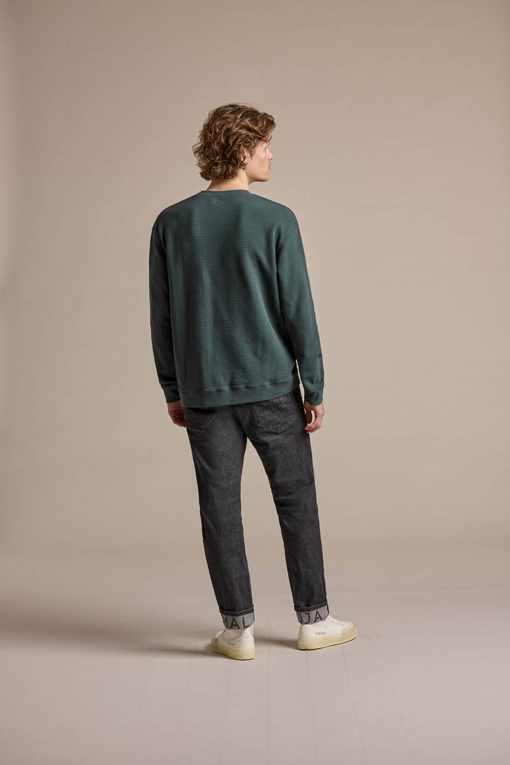 With its relaxed fit, slightly dropped shoulders, and crew neck with a wide rib, this style drapes naturally and comfortably. Cuffed sleeves and hem complete the clean silhouette and keep the shape in place.